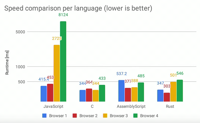 WebAssembly and JavaScript both have the same peak performance. But… JavaScript can easily fall off the “fast path” while WebAssembly will not.